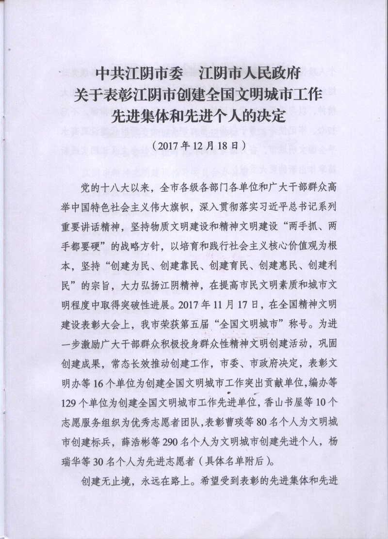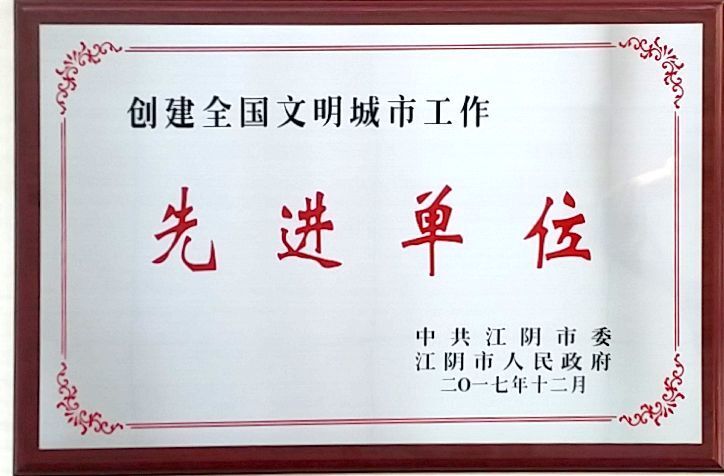 bandao半岛平台(中国)集团被评为17年江阴创建文明城市工作先进集体
